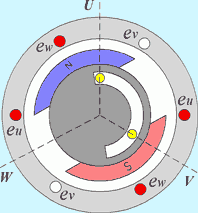 转子由一块永磁体组成,而定子则是绕组线圈,由绕组线圈流经电流的不同来产生对应的磁场,磁场再进行合成来驱动中间的转子转动,其等效为这样。