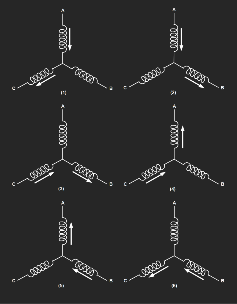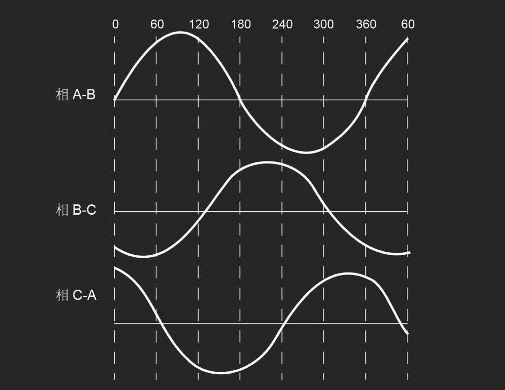 我们假设电流和磁场强度直接线性相关,电流流进就必然流出,三项120°交错就必然能产生一个矢量合成的磁场,最简单的控制方法就是直接用相位分别相差1/3个周期的方波: