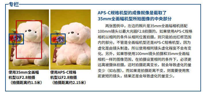 通常我们以全画幅机器为所有焦段的标准。越长的焦段,你能录制的范围就越窄,也就是最直观的”放得越大“,让我在这里引用佳能的一个小图片。