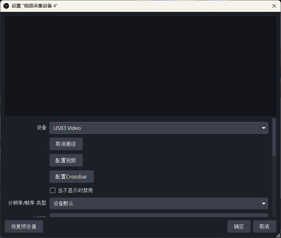 在OBS窗口中选择 ”源“的加号,点击视频采集设备,在下面这个窗口选择你的采集卡名字。