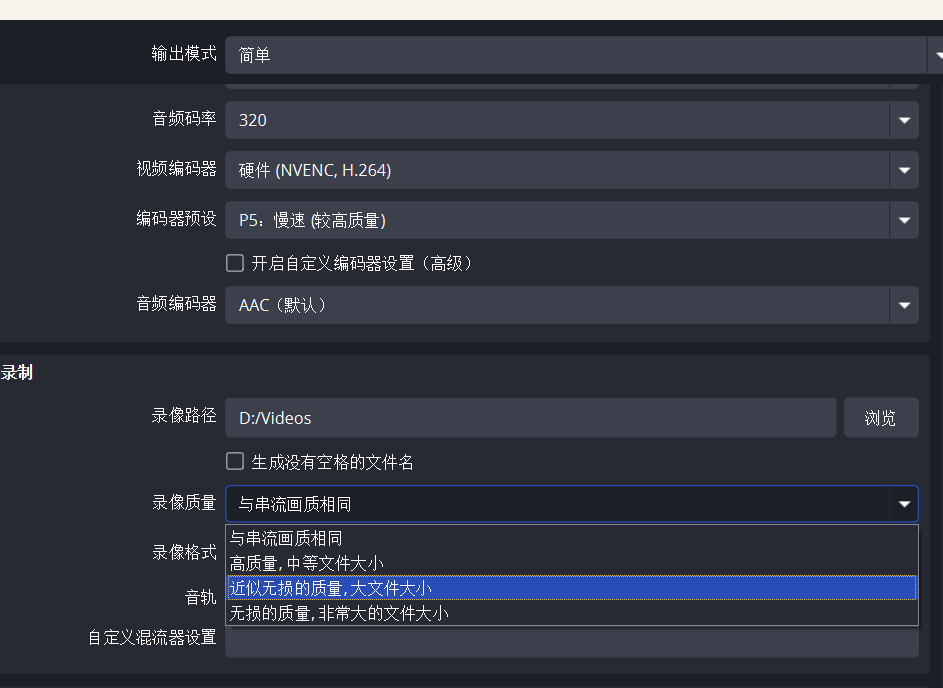 对于录制的设置,我强烈强烈不建议使用”无损的质量“,这会让你的剪辑工作直接爆炸。